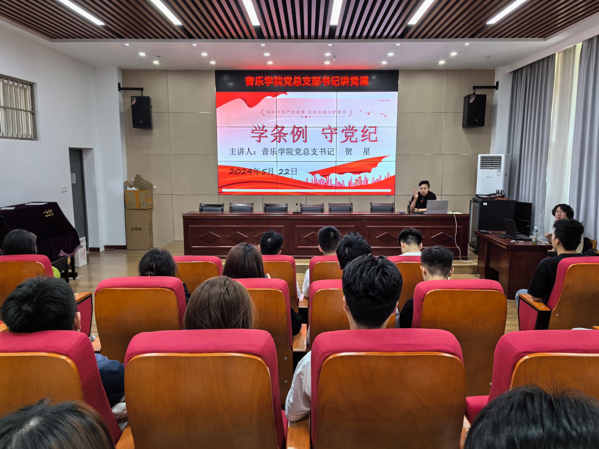 为深入学习领会习近平总书记关于党纪学习教育的重要讲话和重要指示精神,认真贯彻落实中央、省委、市委、校党委决策部署,落实好党纪学习教育。5 月 22 日下午,音乐学院党总支书记贺星为全院学生党员开展“学条例 守党纪”党课教育。贺书记从党纪学习教育的重要性开始,重点围绕“学纪、知纪、明纪、守纪”四个方面,给大家上一堂生动地专题党课。帮助党员深刻理解《中国共产党纪律处分条例》条款要求,真正做到学纪、知纪、明纪、...
