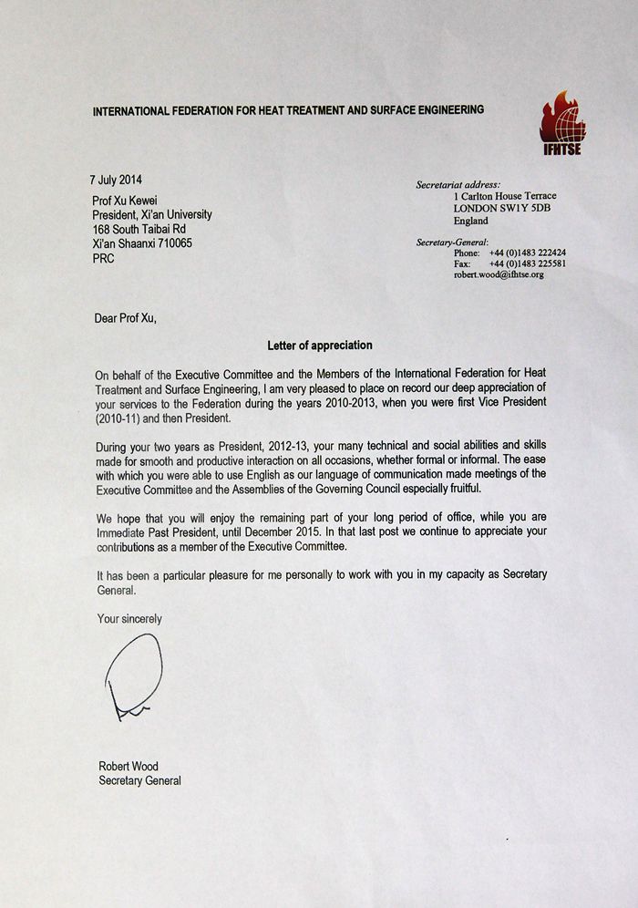 日前,国际热处理与表面工程协会秘书长罗伯特·伍德先生致信我校校长徐可为,对徐可为校长在2010年至2013年作为国际热处理与表面工程协会第一副主席和主席期间为协会所做的贡献表示感谢。来信全文如下: 荣誉感谢...