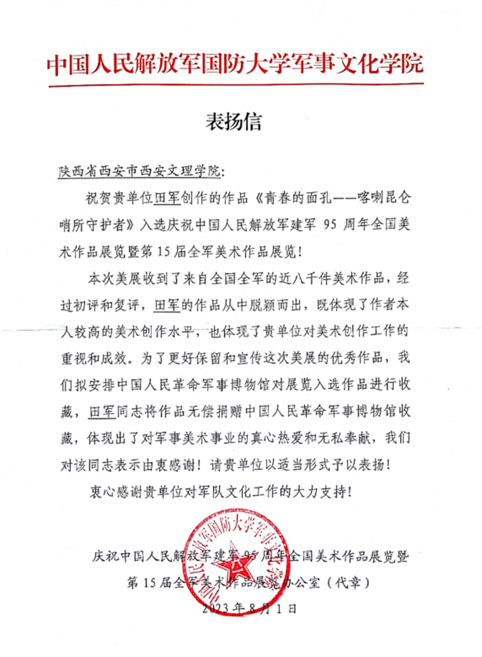 近日,我校收到第十五届全军美术作品展览办公室发来的表扬信,对学校美术与设计学院院长田军创作的作品《青春的面孔一一喀喇昆仑哨所守护者》美术创作水平给予了肯定,对该同志将作品无偿捐赠给中国人民革命军事博物...