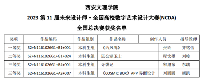 近日,2023年第11届未来设计师·全国高校数字艺术大赛(NCDA)全国赛区评选结果公布,我校美术与设计学院学子获得全国一等奖1项、二等奖1项、三等奖2项。在陕西省赛区我校美术与设计学院学生共获得22个奖项,一等奖6项...