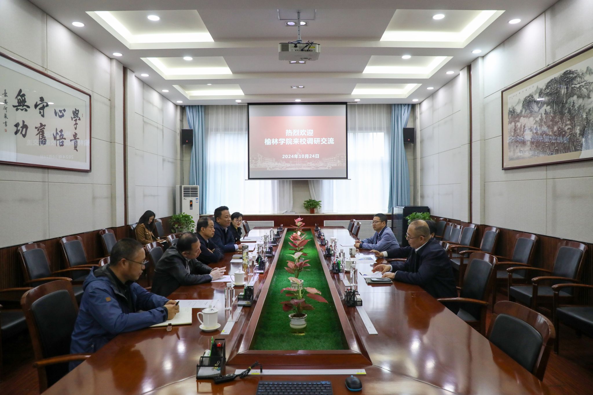 10月24日下午,榆林学院党委书记张新柱、副校长闫龙、科研处处长吴喜军一行3人来我校调研交流,双方围绕校际合作和发展进行了深入研讨交流。党委书记王育选主持会议,党委委员、校务委员鲍锋,党政办、人事处、科研处、教务处等相关部门负责同志参加座谈。王育选对张新柱一行的到来表示热烈欢迎。他简要介绍了学校的基本情况和近年来取得的主要办学成就。他指出,两校有着相似的发展历程和密切的交往渊源,希望双方以此次交流为契机,...