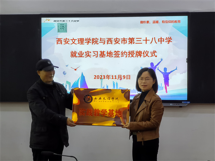 11月9日上午,化学工程学院教学副院长宋瑞娟、学生工作办公室王刚和教育实习负责老师唐永强一行赴西安市第三十八中学参加实践教学基地签约授牌仪式。第三十八中学党总支书记、校长马宏图、高中部教务主任习党伟、德育处主任牛婕和初中部教务主任王雪萍参加协议签订仪式并交流座谈。