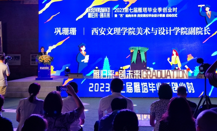 7月6日晚,由市文旅局、商务局、投资局,雁塔区委、区政府主办的“‘雁归来·创未来'2023第七届雁塔毕业季创业时暨‘艺'起向未来 西安高校毕业设计联展”启动仪式在西影电影园区电影广场举办。我校美术与设计学院副院长巩珊珊、公共艺术系系主任胡祖豪作为联展方代表参加活动。