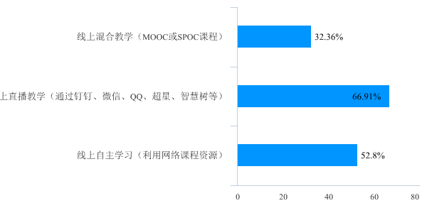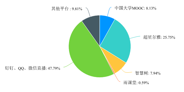 (一)开课基本情况。目前,学校共开设在线课程809门,其中专业课778门,公共课31门。截止315日,全校线上开课共计1508门次,其中公共课246门次,专业课1262门次。通过自建MOOC/SPOC课程、平台课程资源开展混合式教学的占47.55%,利用钉钉、微信、QQ、抖音等直播平台进行线上直播教学的占32.83%,通过资源推送、远程辅导、作业布置等方式督促学生自主学习的占19.62%