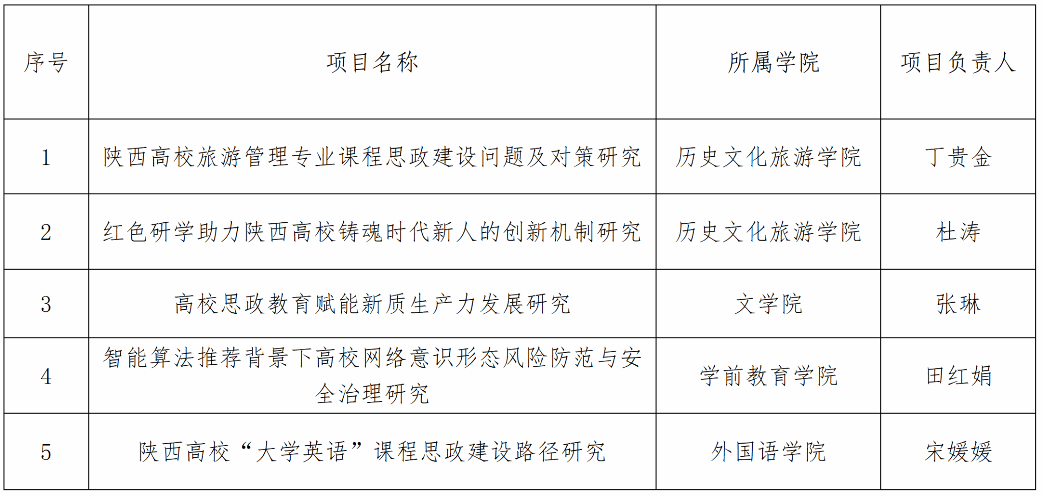 根据《关于陕西省哲学社会科学研究专项2024年度陕西高校思想政治工作研究项目申报的通知》的申报要求,经教师个人申报、二级学院推荐、科研处初审、专家评议并报送处务会审定,遴选出排名前五的推荐名单。现将拟推荐申报名单公示如下,公示期为2024年12月20日至2024年12月23日。