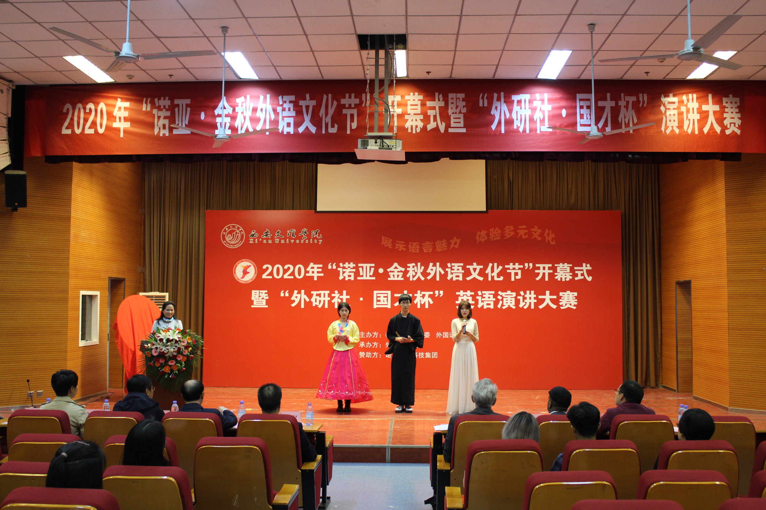 10月7日,我校2020年“诺亚?金秋外语文化节”开幕式暨“外研社?国才杯”英语演讲大赛在明德楼A区报告厅举行。我校副校长韩权、校党委委员、组织部部长袁卫敏、相关职能部门负责人、二级学院教学院长代表、外国语学院领导班子成员、评委、参赛选手及师生代表200余人参加活动。开幕式由外国语学院副院长李征娅主持。