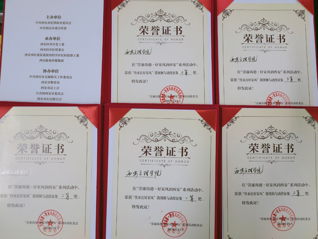 由西安市纪委、市委宣传部主办,西安市经开区、西安报业传媒集团承办的“崇廉尚德—好家风润西安”系列活动自2019年9月启动以来,学校纪委积极参与,先后制作家风微视频和动漫作品10集,好家风书签20套330万张,制作廉政公益海报20幅,编撰《家风家训家规故事选编》指导用书,积极推荐学校专家教授参加“云讲堂”活动,得到了广大市民的高度赞扬,产生了良好的社会影响。学校报送的作品荣获一、二、三等奖共5项,并荣获“崇廉尚德—好家风润西安”系列活动优秀组织奖。