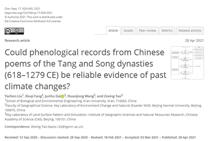 我校生物与环境工程学院刘亚辰博士在历史气候领域国际著名期刊《Climate of the Past》正式刊发了学术论文“Could phenological records from Chinese poems of the Tang and Song dynasties (618–1279?CE) be reliable evidence of past climate changes?”。该论文是以西安九游老哥J9俱乐部官网学院为第一单位,刘亚辰博士为第一作者的研究成果。《Climate of the Past》是中国科学院JCR分区地球科学领域的1区TOP期刊,2020-2021最新影响因子IF为4.295。