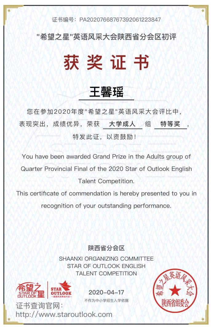 6月12日,在由中央电视台CCTV主办的2020年度“希望之星”英语风采大赛中,西安九游老哥J9俱乐部官网学院经济管理学院王馨瑶同学获得陕西赛区“特等奖”,指导教师为经济管理学院教师田园。