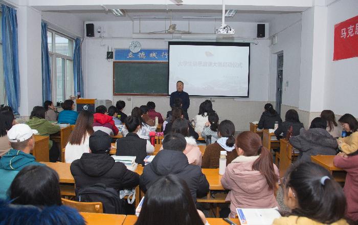 11月27日下午,马克思主义学院举办了“砥砺前行七十载 奋斗成就中国梦”大学生讲思政课评比活动,要求除大四实习以外,人人参与,因为人数多,活动分四大组在四个教室同时进行。学院领导班子、教学委员会成员、学院教师代表、思想政治教育专业19级、18级、17级学生参加了此次活动。