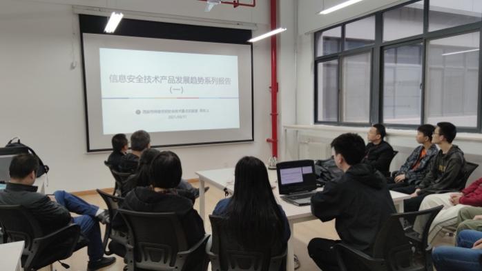 2017级物联网工程专业1班的周志上同学为实验室同学做了关于《信息安全技术产品发展趋势系列报告(之一)》。周志上同学在报告中详细介绍了网络空间安全技术的发展趋势、行业需求、技术支撑、课程学习、聘用岗位与就业前景。陈霖和马国骏对周志上同学的报告进行了点评,给予了高度评价,希望实验室同学向周志上同学学习,尽早确立目标,做好规划,为未来的发展打下坚实基础。