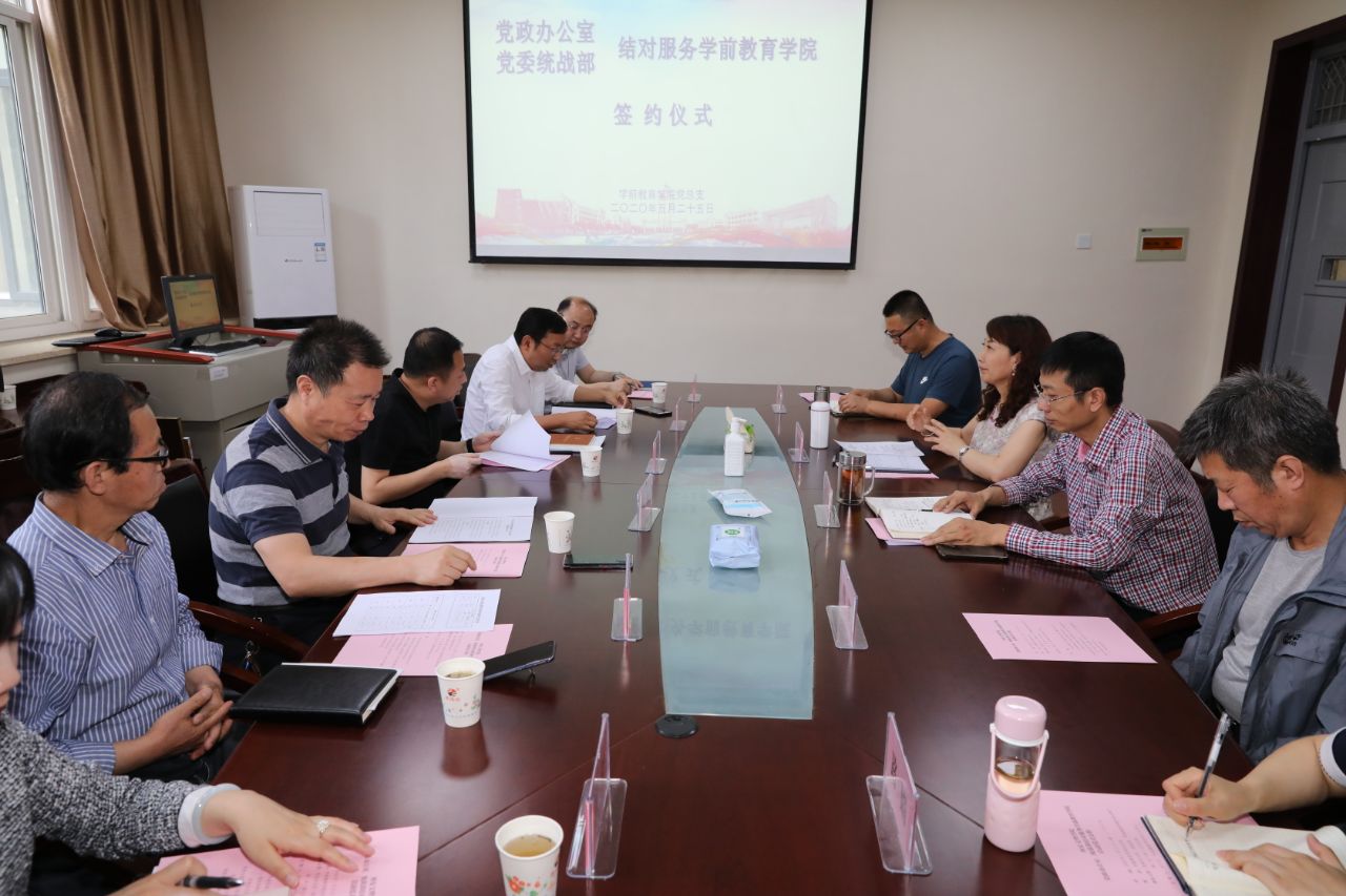 为切实落实学校《党政教辅部门结对服务二级学院实施方案》要求,经过前期充分沟通,5月25日下午学前教育学院与党政办公室、统战部,签订了《党政教辅部门与二级学院结对服务协议书》,副校长韩权、党政办、统战部、学前教育学院全体处级干部及系(部)主任代表参加了会议。会议由党总支书记彭小芸主持。