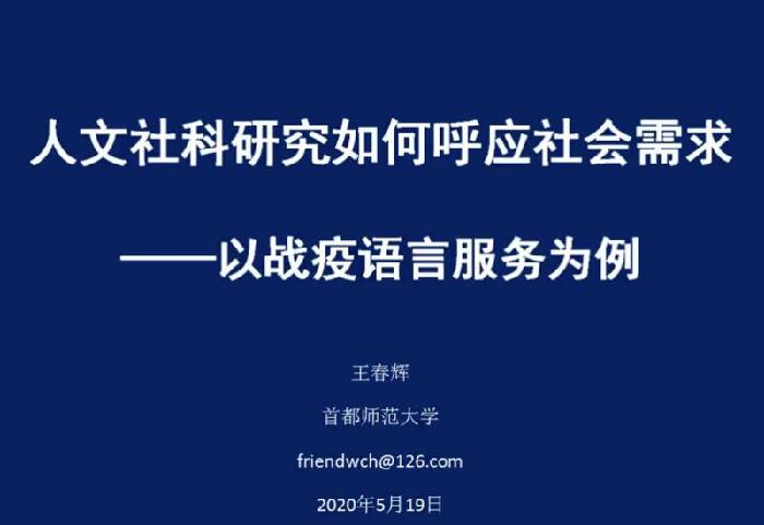 5月19日晚,首都师范大学国际文化学院教授王春辉应邀为文学院师生作了题为《人文社科研究如何呼应社会需求——以防疫语言服务为例》的线上学术报告。文学院汉语国际教育专业师生以及来自陕西师范大学、西北大学和西安外国语大学的语言学专业师生等100余人在线聆听了报告。