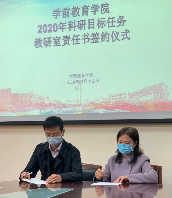 4月14日上午,学前教育学院在弘文楼H0208举行2020年科研目标任务教研室责任书签约会,学院领导班子全体成员和主任以上中层干部参加了活动。