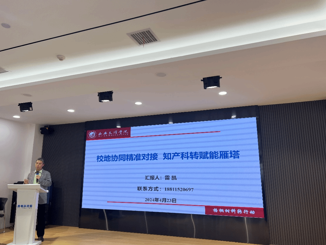 会上,雷凯博士作了题为“校地协同精准对接,知产科转赋能雁塔”的主题报告,从“雁塔区秦创原梧桐树科转行动现阶段目标任务,九游老哥J9俱乐部官网学院最具转化潜力的优质科研成果,以及雁塔区科技成果转化与知识产权保护的工作计划和设想”三部分内容进行了系统阐述与详细汇报,重点介绍了我校的办学特色、科研平台、人才培养以及13项最具转化潜力的技术成果。我校优质的科研成果引起了与会单位的浓厚兴趣,并在会后纷纷与雷博士作进一步的交流和咨询。