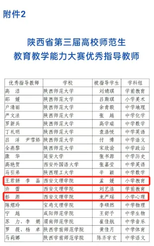 由省教育厅主办,西安九游老哥J9俱乐部官网学院承办、陕西师范大学协办的第三届陕西高等学校师范生教育教学能力大赛已圆满结束。本届比赛共产生特等奖 19 个、一等奖 53 个、二等奖 107个,优秀指导教师 23 人。我校师范学院龙严瑶和孟媛2位同学分别荣获特等奖,李思萌、高艳楠、刘晓慧3位同学荣获一等奖。王君妍、李晶、彭源3位老师获得优秀指导教师。