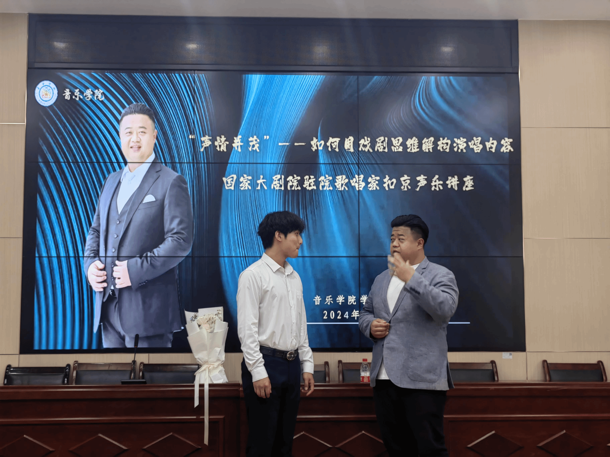 为推动学院专业内涵建设,5月24日下午,音乐学院邀请国家大剧院驻院男高音歌唱家扣京为主讲嘉宾,作了题为《“声情并茂”——如何用戏剧思维解构演唱内容》的声乐讲座。据悉,中国国家大剧院(National Centre for the Performing Arts),是新“北京十六景”之一的地标性建筑,位于人民大会堂西侧,设有歌剧院、音乐厅、戏剧场以及艺术展厅等配套设施。国家大剧院驻院歌唱家是一群具有卓越艺术才华和丰富表演经验的艺术家。