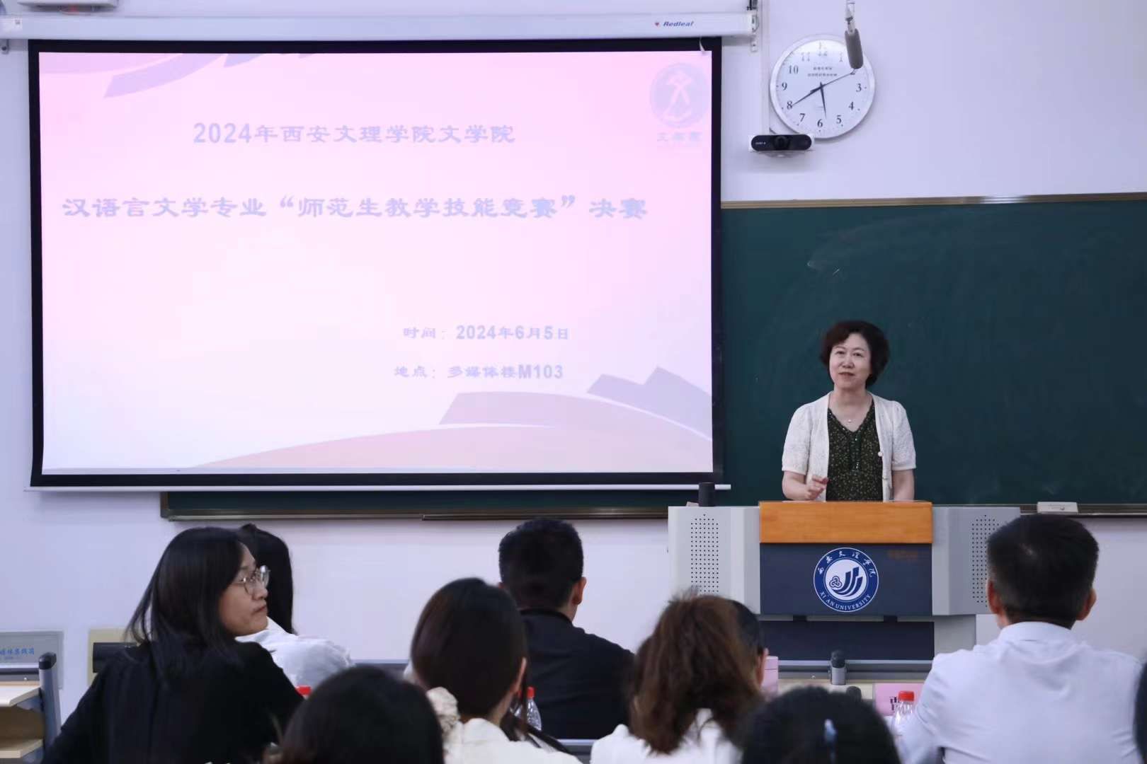 6月5日下午,文学院“师范生教学技能竞赛”决赛于多媒体楼M103圆满落幕。此次比赛邀请西安市教育科学研究院副院长、陕西省特级教师、正高级教师、西安九游老哥J9俱乐部官网学院特聘教授贾玲担任评委组长,邀请西安市第二十六中李小冬,高新第三初级中学薛宏飞,西安市曲江第三中学高云云,西安滨河学校肖瑶担任评委。文学院院长郝延军,副院长苏羽,中国语言文学系主任于展东、副主任李冰清、专业教师李莉、武莉带领汉语言文学专业2021级和2022级同学观摩了此次比赛。