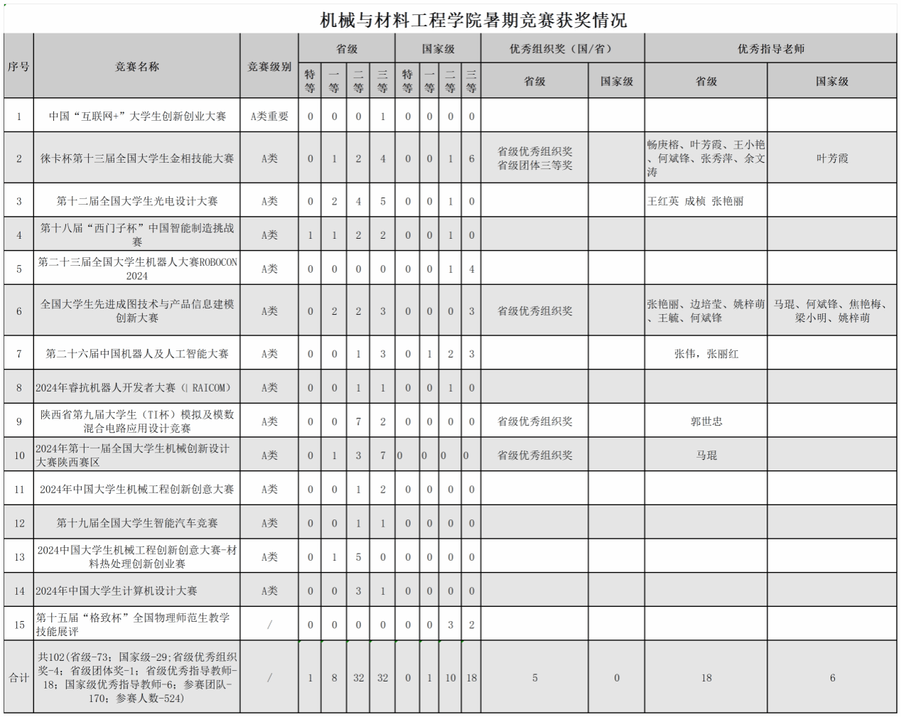 据悉,机械与材料工程学院师生在中国国际大学生创新大赛(2024)、徕卡杯第十三届全国大学生金相技能大赛和第二十六届中国机器人及人工智能大赛等16项学科竞赛(1个A类重要、14个A类)中共获奖项107个(详见附件),其中国家级奖项29项、?省级奖项73项、省级优秀组织奖4项、省级团体奖1项。6位教师荣获国家级优秀指导教师荣誉称号,18位教师荣获省级优秀指导教师荣誉称号。?参赛团队达到170个,参赛人数524人。