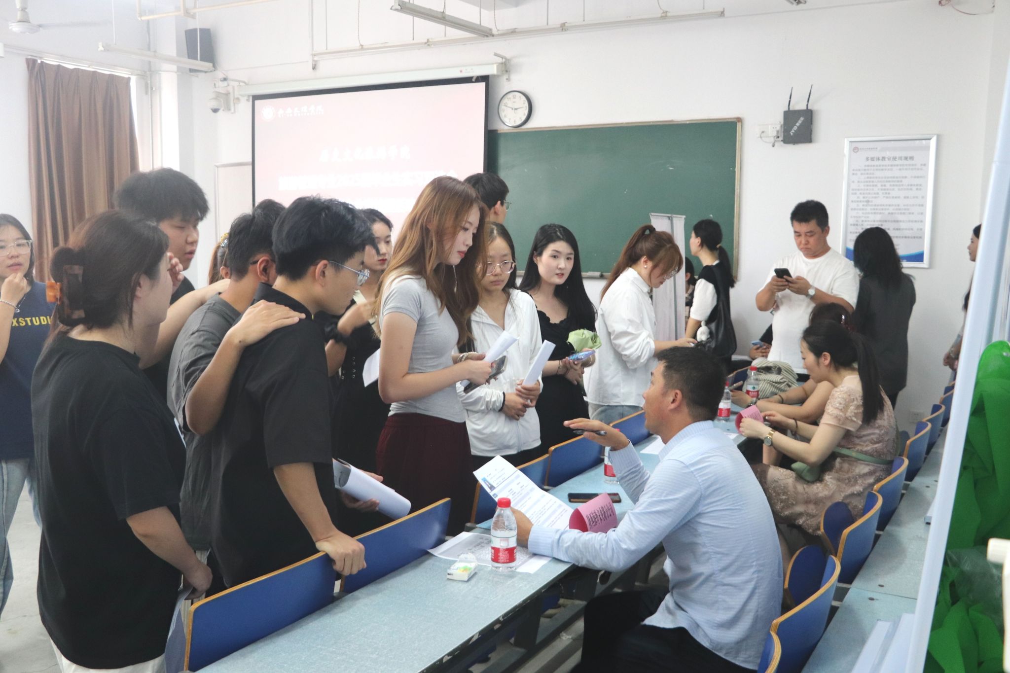 崔林、李东升代表学院向参加双选会的受邀单位表示热烈欢迎,并感谢合作单位多年来对学生实习就业工作的大力支持。刘世栋建议毕业生本着“贯通实习+就业”的原则,在实习过程中多多积累工作经验,为未来就业做好充分准备。旅游管理系教师现场为毕业生实习提供咨询和指导。受邀单位在明德楼A区两个分会场向毕业生进行了宣讲,并就岗位需求、岗位特点、薪资待遇及职业发展等方面与学生进行深入交流。