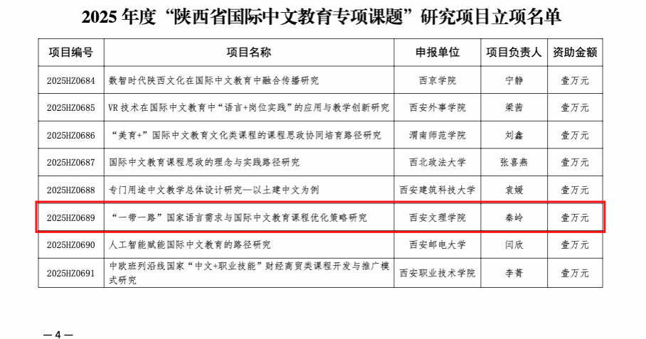 秦岭副教授的研究项目《“一带一路”国家语言需求与国际中文教育课程优化策略研究》成功获得“陕西省国际中文教育专项课题”立项。该项目将深入探索“一带一路”国家的语言需求与中文教育课程的优化路径,为推动国际中文教育发展做出积极贡献。张蕾副教授的研究项目《陈彦戏剧文学作品的翻译生态重构与文化传播研究》也获得了“陕西省新时代中国地域文学文化外译与国际传播专项课题”资助。此次获奖,不仅体现了两位在各自研究领域中的学术能力,也反映了学院在哲学社会科学领域的创新实力与科研影响力。两位教师表示,将以此为契机,进一步深化学术研究,积极推动陕西省社会科学研究的多元化发展,并为实现区域文化振兴贡献智慧与力量。