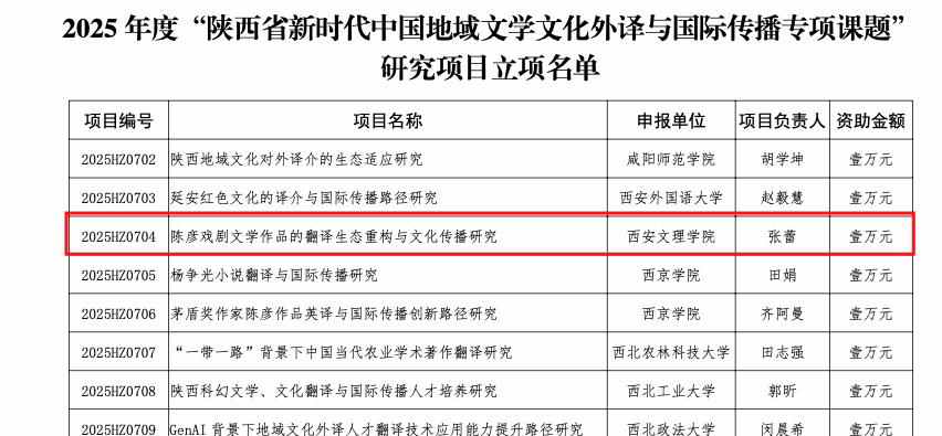 近日,陕西省社会科学界联合会发布了2025年度陕西省哲学社会科学研究专项资助项目名单,文学院秦岭副教授与张蕾副教授凭借各自优秀的研究设计,双双荣获资助。