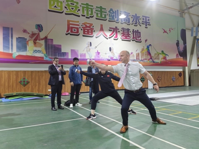 座谈结束后,来宾走进体育馆,参观了教学场地和设施,饶有兴致地观看了柔力球、跳绳、击剑专业的训练课,并对我校丰富又接地气的课程项目赞誉有加。