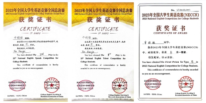 8月4日,从第二十二届全国大学生英语演讲赛半决赛中脱颖而出的120名选手进入演讲赛决赛,陕西省24人顺利晋级决赛。辛晓银临场发挥出色、表现出众,荣获全国大学生英语演讲赛决赛二等奖。