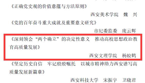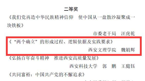 近日,西安市委党史研究室西安市社科院关于《中共中央关于党的百年奋斗重大成就和历史经验的决议》研究成果评选结果揭晓,我校教师的三项研究成果喜获一等奖1项、二等奖2项。