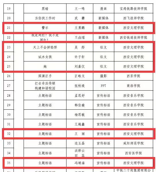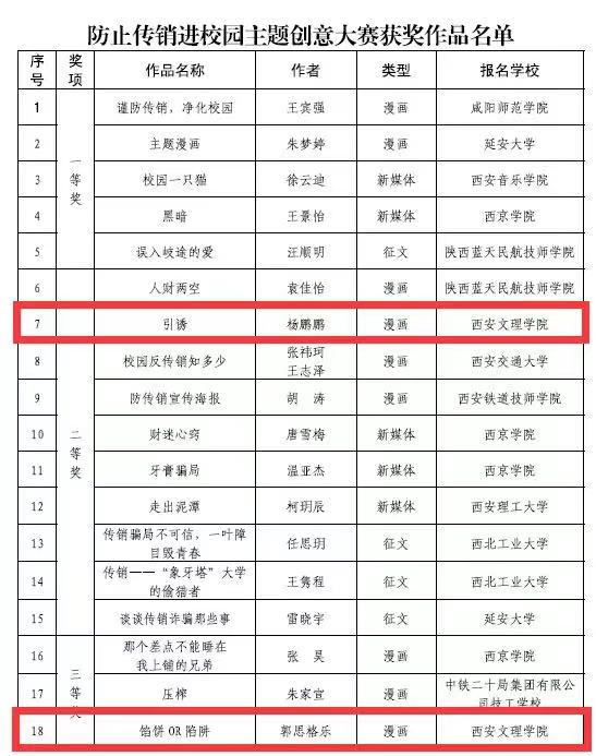 近日,由陕西省市场监管局、省教育厅、省公安厅、省人社厅联合举办的防止传销进校园主题创意作品征集大赛获奖结果揭晓。我校荣获优秀组织奖,作品《引诱》荣获二等奖,《馅饼OR陷阱》《警示》等7篇作品荣获三等奖,《拥抱真正的正能量》《擦亮眼睛,莫上贼‘传’》等9篇作品荣获优秀作品奖。作品类型涵盖漫画、新媒体、征文、宣传标语等。