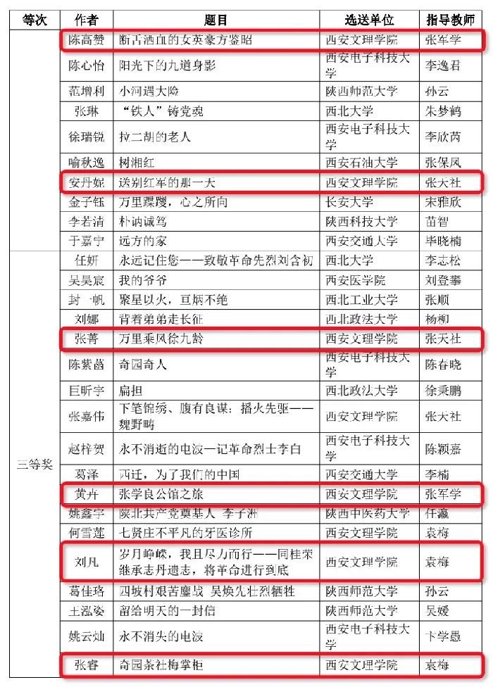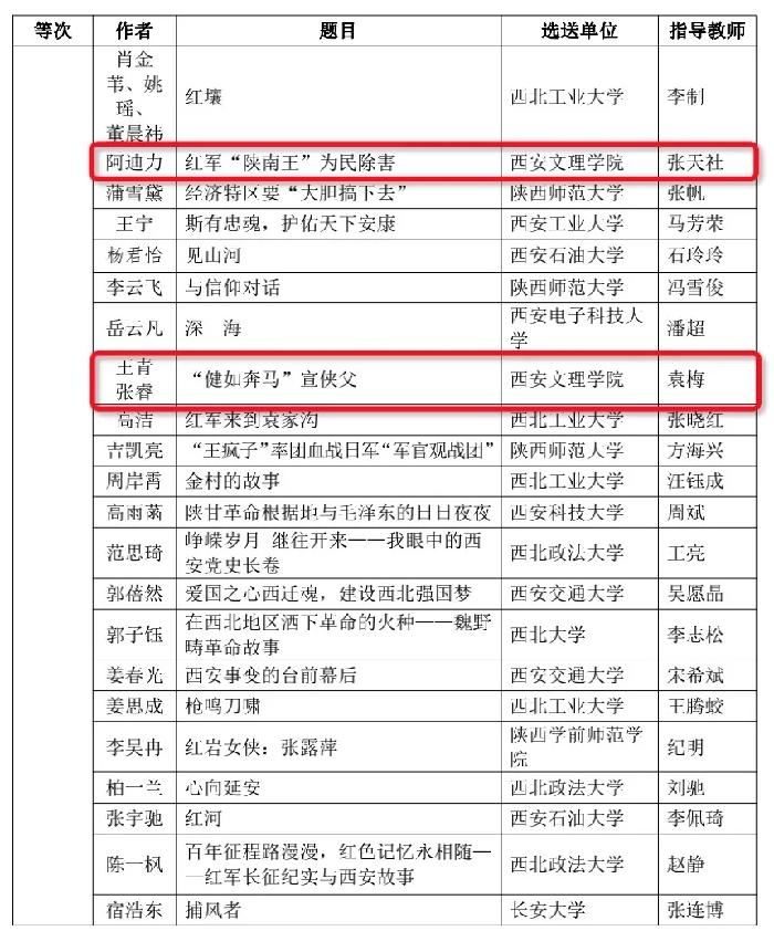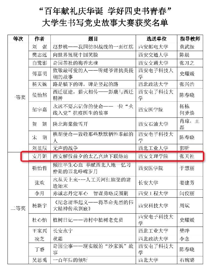 近日,由中共陕西省委党史研究室、中共陕西省委教育工委、共青团陕西省委、中共西安市委党史研究室联合举办的“百年献礼庆华诞 学好四史书青春”大学生书写党史故事大赛获奖结果揭晓。我校荣获优秀组织奖,《西安解放前夕的太乙宫地下联络站》等3篇作品荣获二等奖,《万里乘风徐久龄》等8篇作品荣获三等奖。