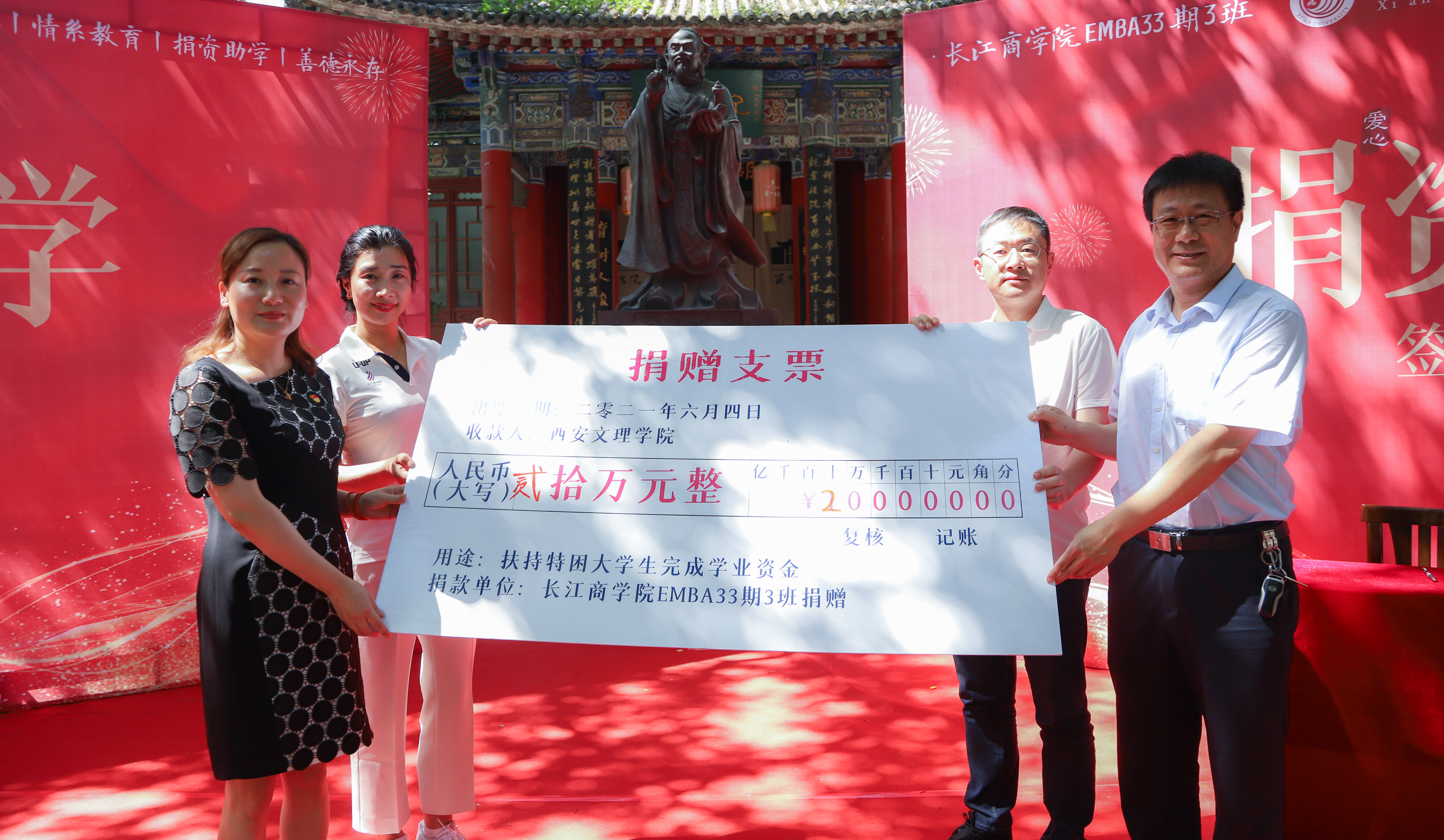 本次签约,是由长江商学院EMBA33期3班学员出资20万元设立“长江商学院EMBA33期3班”助学金,用于资助我校家庭经济困难学生,设助学金办公室在我校学生处学生资助管理中心,负责受助学生选定、助学金发放、学生教育引导工作。