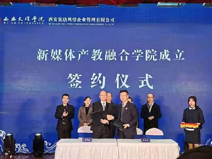 新媒体产教融合学院由西安九游老哥J9俱乐部官网学院与西安乾唐风情企业管理有限公司联合成立,依据国家《现代产业学院建设指南(试行)》的通知,探索建设多主体共建共管共享的现代产业学院,以此推动高等教育与区域产业联动创新发展的的文件指示精神,依托高校良好的教学、科研优势和企业市场、运营优势,针对新媒体电商行业职业化、专业化人才需求痛点,着力打造集产、学、研、创、用于一体,互补、互利、互动、多赢的复合型人才培养创新平台,建强优势特色专业,完善人才培养协同机制,实现共建共管共享 “校企联合”等多样合作办学模式。为提升陕西新媒体产业竞争力和发展新动能提供人才支持和智力支撑。