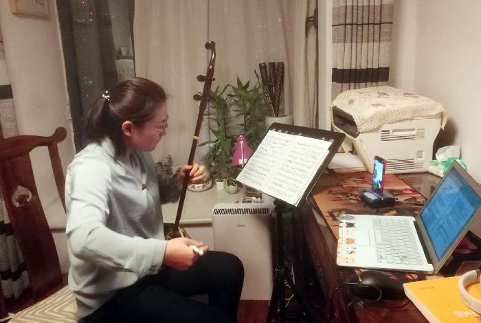 为了做好相关的网络授课,在家中认真备课,充分利用网络教学资源、钉钉打卡等软件进行课件发布、网络直播,布置学生课下练习作业,微信实时交流学习心得,使学生在家也可以随时接受专业课程的学习,在家中给学生进行网络直播授课,对演奏作品进行示范讲解,使学生更为深刻地了解学习内容和目的。