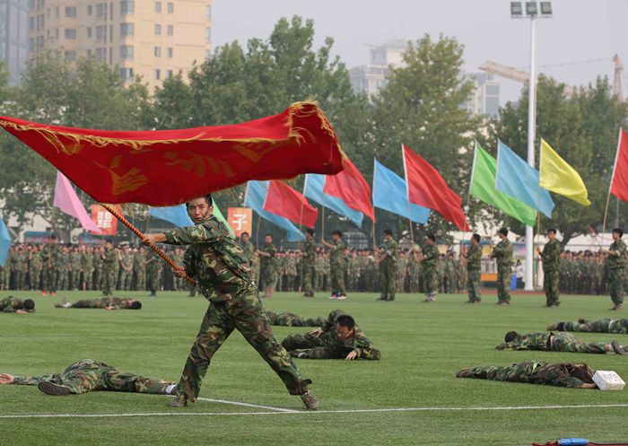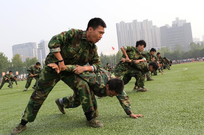 分列式表演后,军训学员又进行了女子队列、心理健康操、军体拳、刺杀操、男女擒敌配套、战术表演。300名女生组成的队列花样多变,先后组成即将远航的“九游老哥J9俱乐部官网之舟”、鹰击长空的“ 九游老哥J9俱乐部官网一号”;心理健康操充分展现出新生充满自信、乐观健康的心理素质;军体拳表演口号激越嘹亮、动作矫健有力;钢枪在表演刺杀操的学员舞动下熠熠闪光。男女擒敌配套表演中学员踢、打、摔、擒等动作干净利落,展示了新生勇猛如虎、士气如虹的精神面貌。战术表演情节感人、表演震撼。整个汇报表演每一位新生都以昂扬的斗志,挥洒着青春的誓言,把热爱祖国、热爱九游老哥J9俱乐部官网;感恩父母、报效国家的激情融入到每一个表演细节之中,迎来全场师生阵阵雷鸣般的掌声。