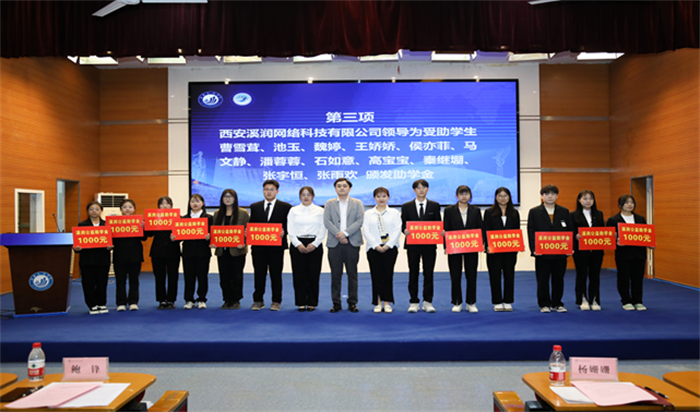 仪式伊始,学院党总支书记张九东致辞,向西安溪润网络科技有限公司的捐助表达了由衷的感谢,并表示学院将会一如既往地支持公益事业,期待更多社会力量的加入,为更多学子提供成长、成才的机遇。随后,企业领导为12位受助学生颁发助学金,每人1000元,共计1.2万元,受助学生代表池玉发言,向企业和学院表达了真挚的感激之情,表示他们将倍加珍惜这份关爱与帮助,用实力回馈学院、公司与社会。仪式最后由校党委委员、校务委员鲍锋为西安溪润网络科技有限公司颁发证书及纪念牌。