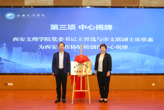 4月12日下午,“荆山有玉,漆水蕴情”——文字世界里的乡愁——西安市作协驻校创作中心揭牌仪式暨西安青年作家唐勇散文集《老河》座谈会在我校举行。西安市文联副主席蔡鑫和校党委书记王育选共同为西安市作协驻校创作中心揭牌。