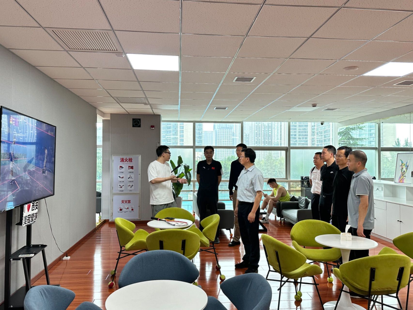 西安美冠壁球俱乐部总经理宋鸽及运营总监张夏乐对西安九游老哥J9俱乐部官网学院一行的到来表示热烈欢迎,并参观了俱乐部的壁球场地。张总详细介绍了壁球运动的独特魅力与全球影响力及作为“室内运动之王”百余年来在全球范围内受到的高度推崇状况。随着壁球运动的逐渐普及,俱乐部面临着专业人才紧缺的挑战,尤其是在教练员与裁判员方面存在较大的需求缺口。针对这一现状,双方进行充分交流研讨。