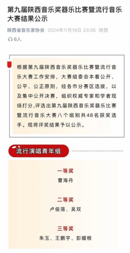 “陕西音乐奖”系由中共陕西省委宣传部批准设立,陕西省文学艺术界联合会主办、陕西省音乐家协会承办的全省唯一的权威性音乐艺术类综合奖项。本届赛事吸引了全省1500余名音乐精英参与,竞争异常激烈。曹海丹以出色的舞台表现一举夺魁,为我校赢得了荣誉,充分展现了音乐学院青年教师的专业实力和艺术风采。