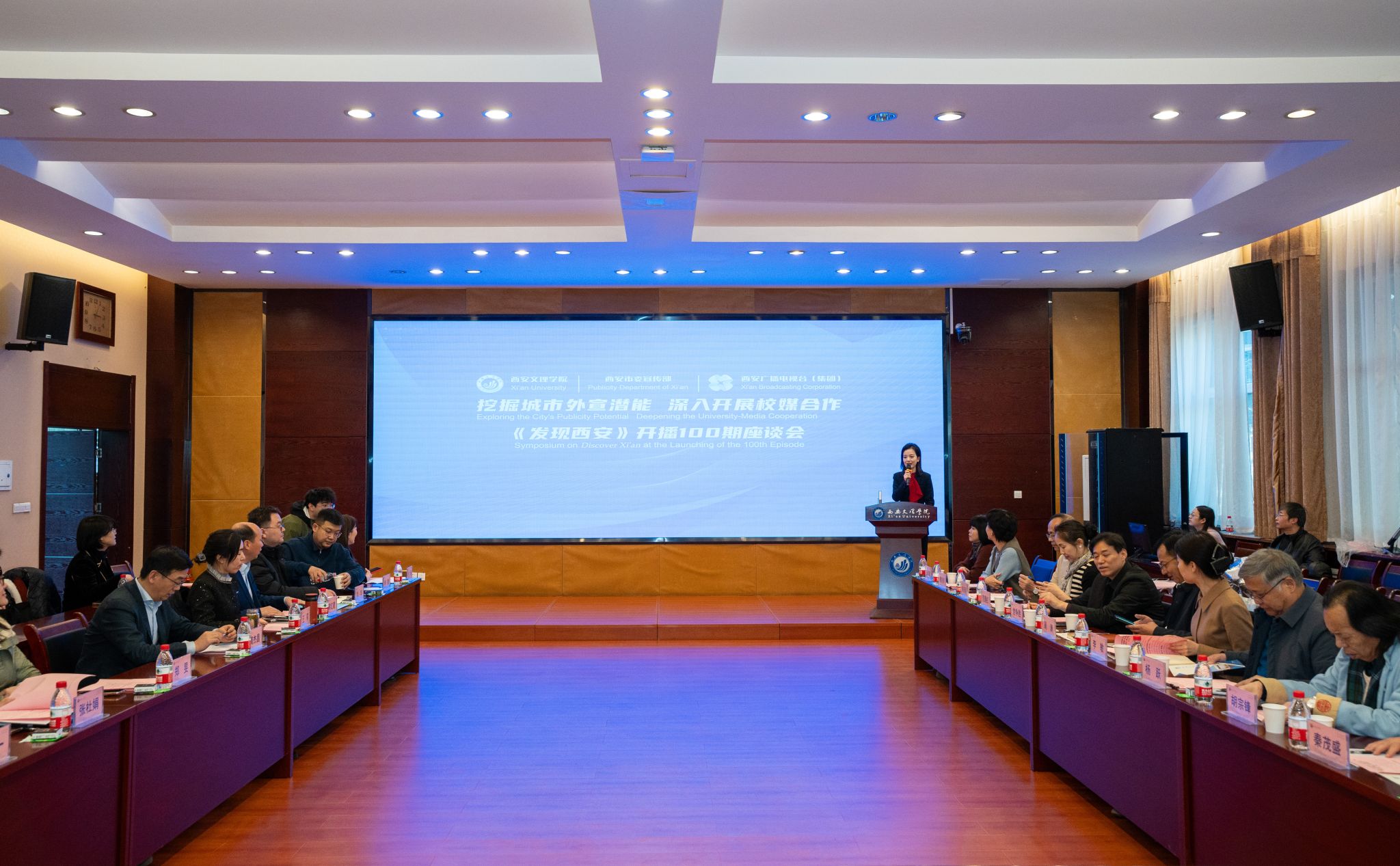 1月16日下午,以“挖掘城市外宣潜能,深化校媒合作”为主题,由西安广播电视台(集团)和西安九游老哥J9俱乐部官网学院联合举办的西安国际传播双语节目《发现西安》开播100期座谈会在我校举行。我校校长陈刚、副校长龚杰昌、西安广播电视台(集团)总编辑周清、西安市委宣传部对外宣传处处长李敏,以及我省翻译与国际传播领域知名专家共同出席会议。