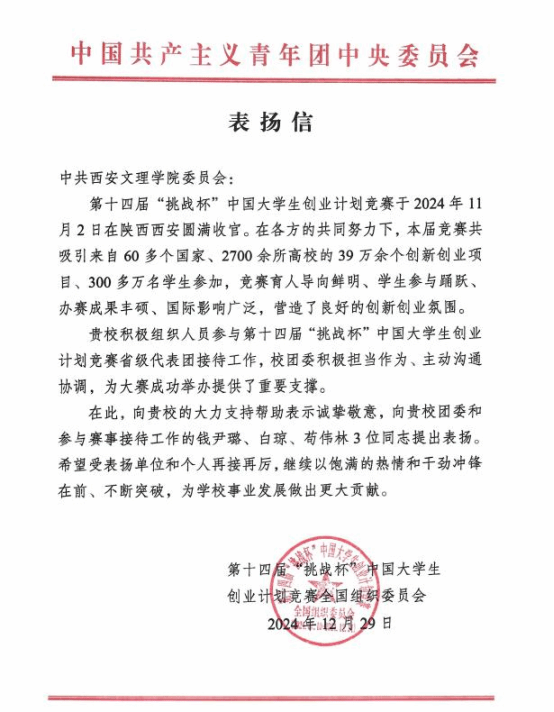 近日,我校收到第十四届“挑战杯”中国大学生创业计划竞赛全国组织委员会发来的表扬信,对我校团委及参与赛事接待工作的钱尹璐、白琼、苟伟林三位同志提出表扬。