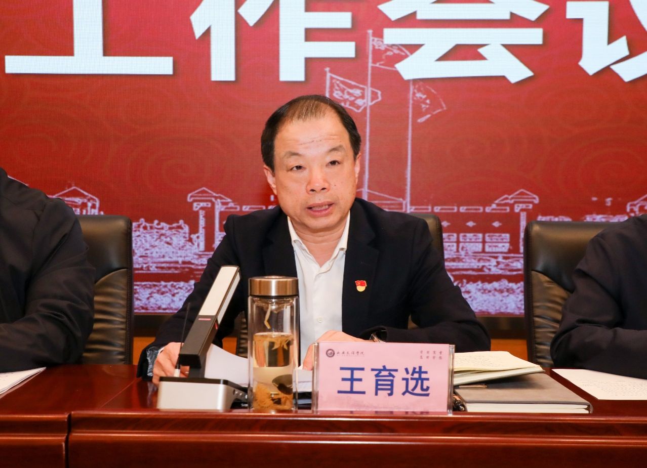 王育选安排部署了2025年全面从严治党重点任务,提出五点要求:一是要深刻领悟全面从严治党新要求,加强党对学校工作的全面领导,扎实开展深入贯彻中央八项规定精神学习教育,强化理论武装筑牢思想根基;二是要着力加强基层党组织建设,全面贯彻新时代党的组织路线,积极打造党建品牌;三是要严明党的政治纪律和政治规矩,大力弘扬教育家精神,落实师德师风“一票否决”制度,持续强化正风肃纪反腐,营造风清气正的政治生态;四是要严格落实意识形态工作责任制,切实守好学校意识形态领域安全底线;五是要落实全面从严治党主体责任。