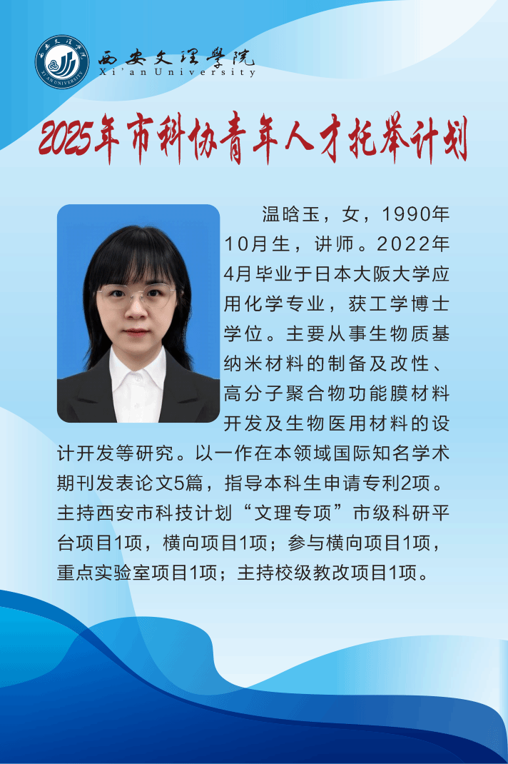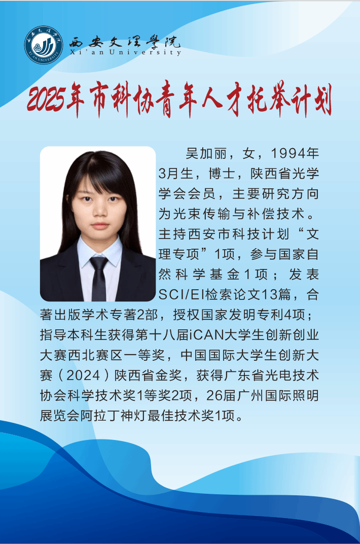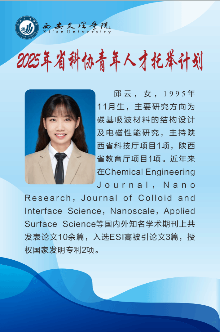 近日,陕西省科协、西安市科协陆续公布了2025年青年人才托举计划项目评审结果。我校在此次评审中表现出色,机械与材料工程学院邱云博士成功入选陕西省科协青年人才托举计划,信息工程学院吴加丽博士、化学工程学院温晗玉博士成功入选西安市科协青年人才托举计划,为学校的人才培养与科研发展再添新动力。