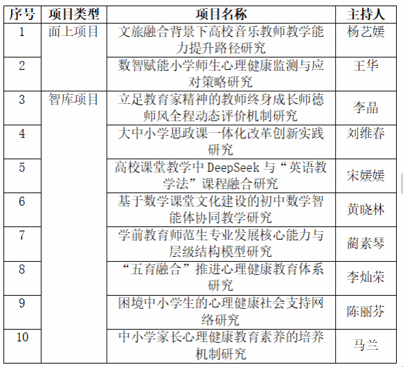 近日,陕西省教育厅公示了2025年度陕西省教师教育改革与教师发展研究项目拟立项名单。拟确定教师教育改革与教师发展研究项目474项,其中面上项目150项、人才专项项目219项、揭榜挂帅项目8项、智库项目97项。我校成功获批项目10项,其中面上项目2项,智库项目8项,获批数量位列同类院校首位。