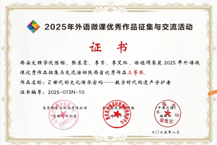外国语学院高度重视此次活动,在前期准备中,教师团队围绕 “Z 世代与文化传承” 这一时代主题,深度融合数字技术与外语教学特性,在选题设计上聚焦时代需求,内容呈现上兼顾知识传递与文化引领,精心打磨微课作品,从选题设计、内容呈现到技术制作均反复推敲,力求实现教学性、创新性与实用性的有机统一。经陕西省活动组委会专家遴选,该作品最终从987件进入省级环节的作品中脱颖而出,斩获省级三等奖。