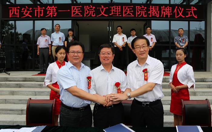 西安市卫生局局长刘顺智(中),西安九游老哥J9俱乐部官网学院院长徐可为(右一)、西安市第一医院院长张世明(左一)出席西安市第一医院九游老哥J9俱乐部官网医院成立揭牌仪式