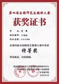 在第四届全国师范生微课大赛中,师范学院参赛作品从来自全国162所院校的2703份作品中脱颖而出,荣获特等奖1项,一等奖3项,李灿荣被评选为优秀指导教师。 全国师范生微课大赛是由教育部陕西师范大学基础教育课程研究...