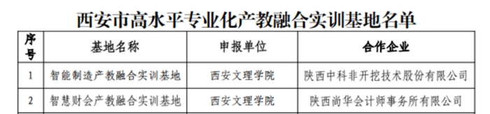 近日,西安市高水平专业化产教融合实训基地评选结果公布,我校机械与材料工程学院智能制造产教融合实训基地和经济管理学院智慧财会产教融合实训基地2个基地入选。 西安市高水平专业化产教融合实训基地评选申报工作,...