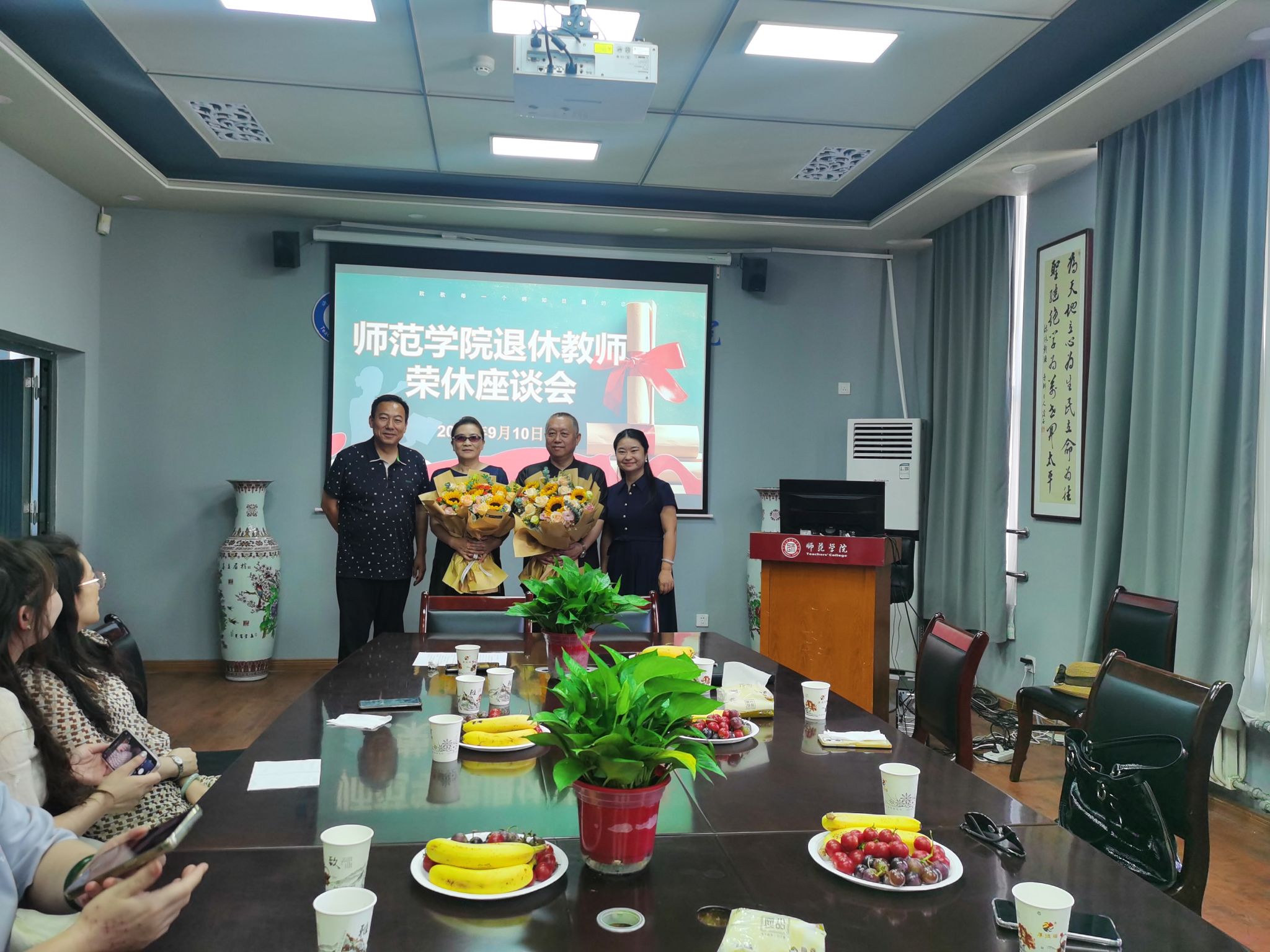 为营造更为温馨舒适的工作环境,丰富学院文化建设内涵,增强教职工的幸福感、获得感与凝聚力,在 9 月 10 日教师节当天,师范学院于明德楼 B0312 会议室为罗瑾副教授和杨泳副教授举办了荣休会,向为学院建设和发展作出突出贡献的两位老师致以崇高敬意,同时也为当天过生日的杨老师送上了诚挚的生日祝福。荣休会由院长曹莹主持。上午 10 点,退休教师荣休仪式盛大举行。学院教职工代表与学生代表齐聚一堂,共同见证这一庄重且温馨的时刻。...
